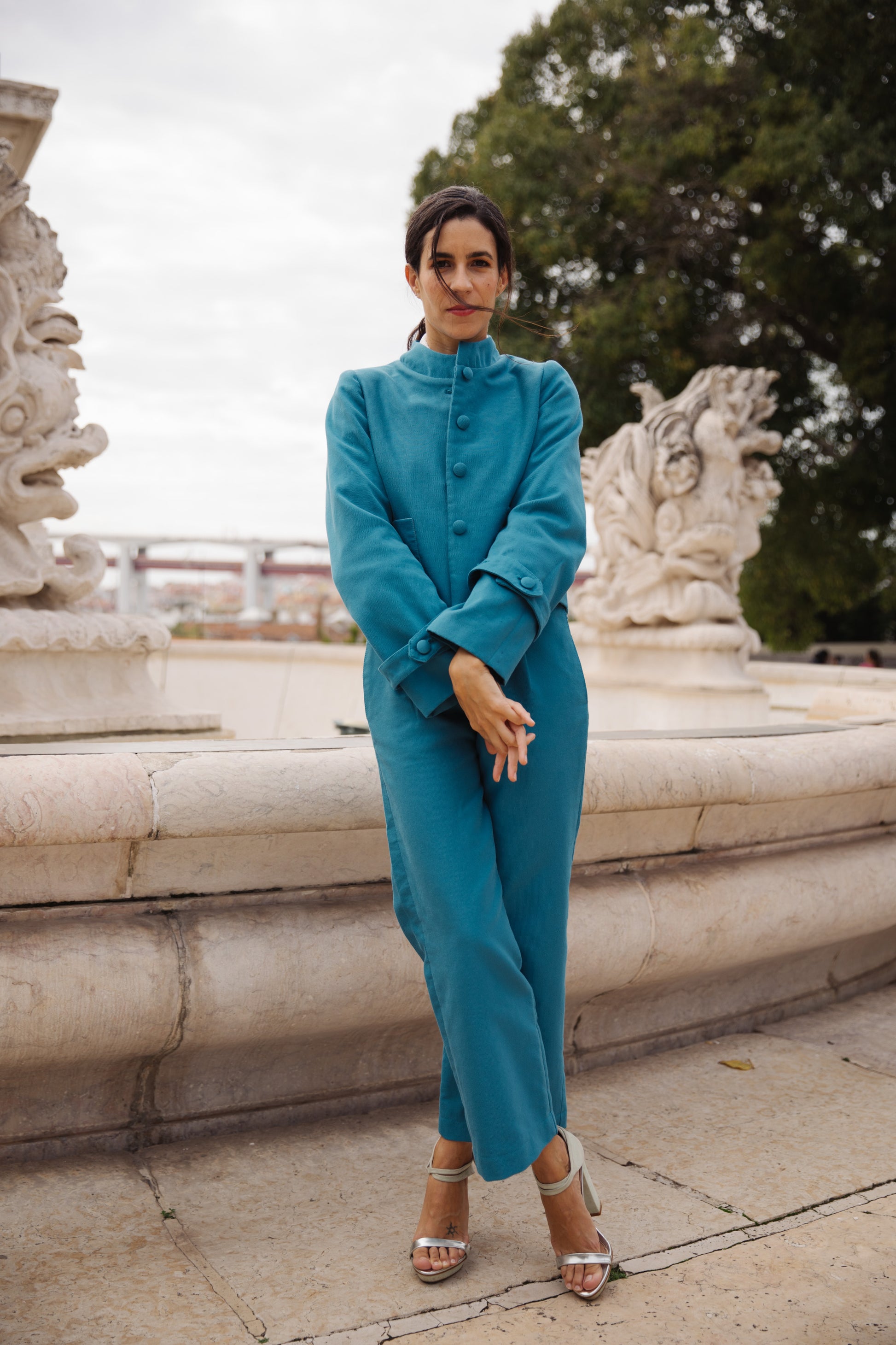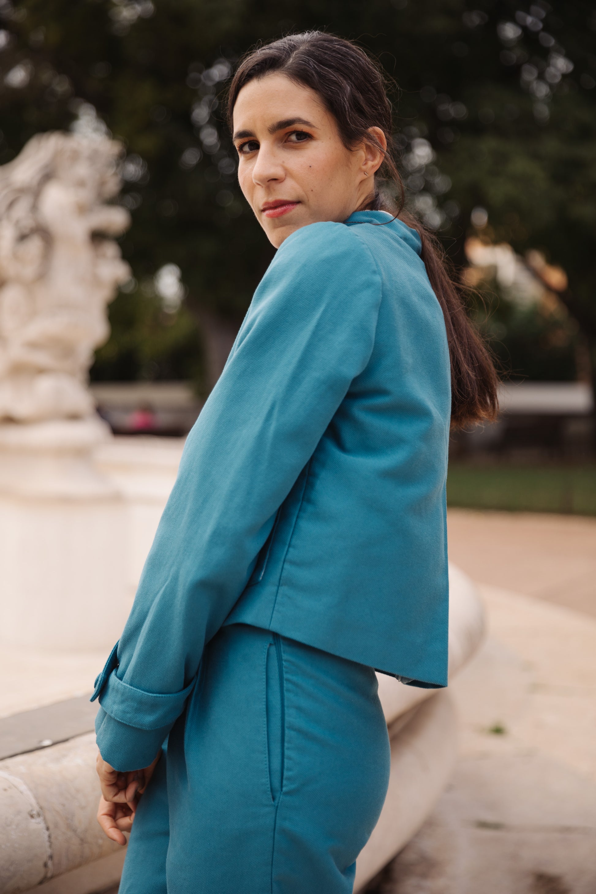 A cool take on the suit blazer. A short jacket, big buttons and stand-up collar. There is a male fold detail on the back and the sleeves have two ways to be fastened – the true sleeve width and a slimmer one, that creates another special detail. Fully lined.